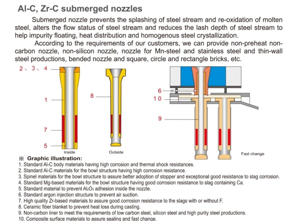 Погружное входное сопло Laurel является одним из основных компонентов в процессе непрерывного литья. Он похож на «точный навигатор» для потока расплавленной стали и играет решающую роль в обеспечении плавного и эффективного протекания процесса непрерывного литья. Его уникальная погружная конструкция позволяет погружать наконечник сопла непосредственно в расплавленную сталь. Это не только эффективно предотвращает вторичное окисление расплавленной стали, но и точно направляет расплавленную сталь для равномерного и стабильного потока в форму, обеспечивая равномерное распределение тепла во время затвердевания литейной заготовки и предотвращая локальные явления перегрева или недоохлаждения. Таким образом, улучшается качество литейной заготовки. Кроме того, форма и размер погружного входного сопла могут быть гибко настроены в соответствии с различными требованиями к процессу непрерывного литья. Будь то производство тонких слябов, слябов средней толщины или заготовок из специальной легированной стали, он может быть идеально приспособлен для обеспечения стабильного производства высококачественных литейных заготовок в сталелитейной промышленности.